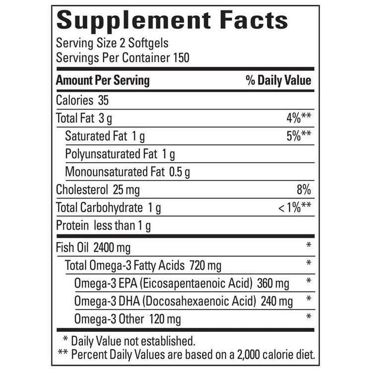 مکمل Fish Oil از برند معتبر Nature Made با دوز ۱۲۰۰ میلیگرم روغن ماهی خالص در هر سافتژل، منبعی سرشار از اسیدهای چرب ضروری EPA و DHA است که به حفظ سلامت قلب، مغز، مفاصل و سیستم ایمنی کمک میکند. این بسته بزرگ ۳۰۰ عددی انتخابی اقتصادی و کاربردی برای استفاده طولانیمدت است.