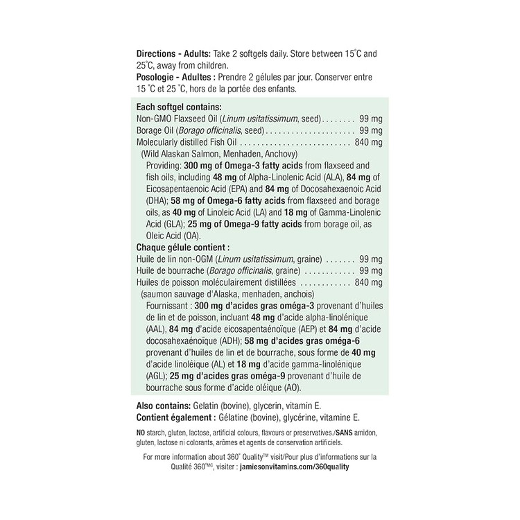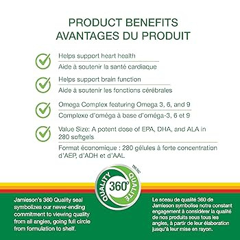 این مکمل از برند معتبر Jamieson ترکیبی متعادل از اسیدهای چرب ضروری امگا ۳، امگا ۶ و امگا ۹ را فراهم میکند که برای سلامت عمومی بدن ضروری هستند. این اسیدهای چرب به بهبود سلامت قلب و عروق، تقویت عملکرد مغز، بهبود وضعیت پوست و مو، و پشتیبانی از مفاصل کمک میکنند. فرمولاسیون این محصول از روغن ماهی، روغن بذر کتان و روغن گلرنگ تهیه شده و منبعی طبیعی و باکیفیت از این چربیهای مفید است.