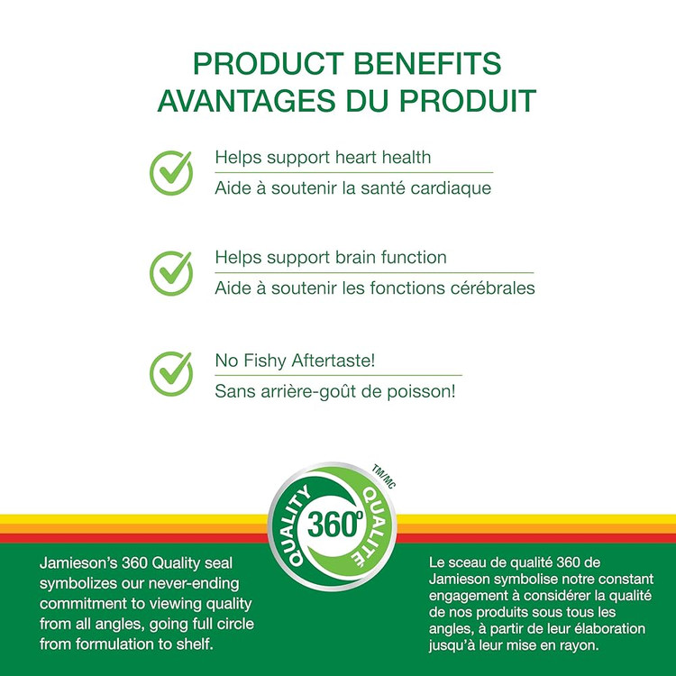 مکمل امگا ۳ جیمیسون ترکیبی از روغن سالمون وحشی و سایر روغنهای ماهی غنی از EPA و DHA است که به سلامت قلب و عروق، عملکرد مغز، بینایی و کاهش التهاب مفاصل کمک میکند. این محصول با تکنولوژی ویژه No Fishy Aftertaste ساخته شده تا هیچگونه طعم و بوی ناخوشایند ماهی در دهان باقی نماند.