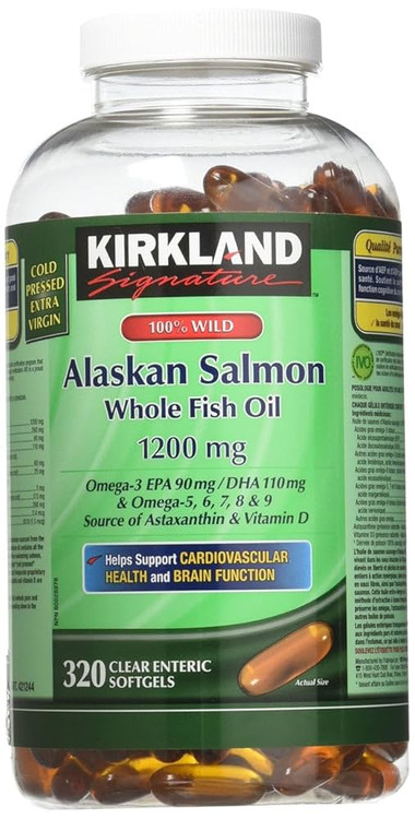 Kirkland Signature 100% Wild Alaskan Salmon Oil – 90 EPA, 110 DHA, 1200mg – 320 Enteric Coated Softgels