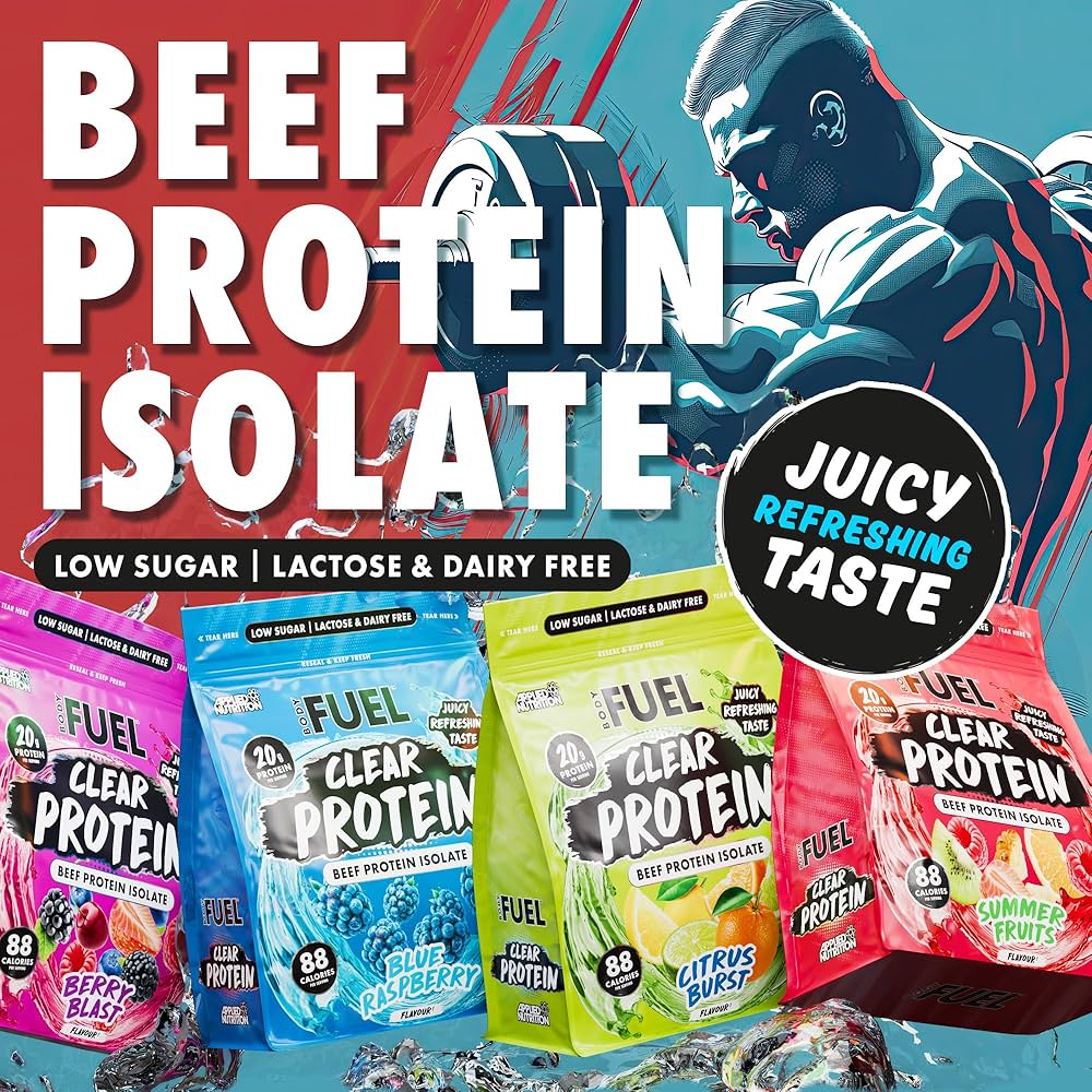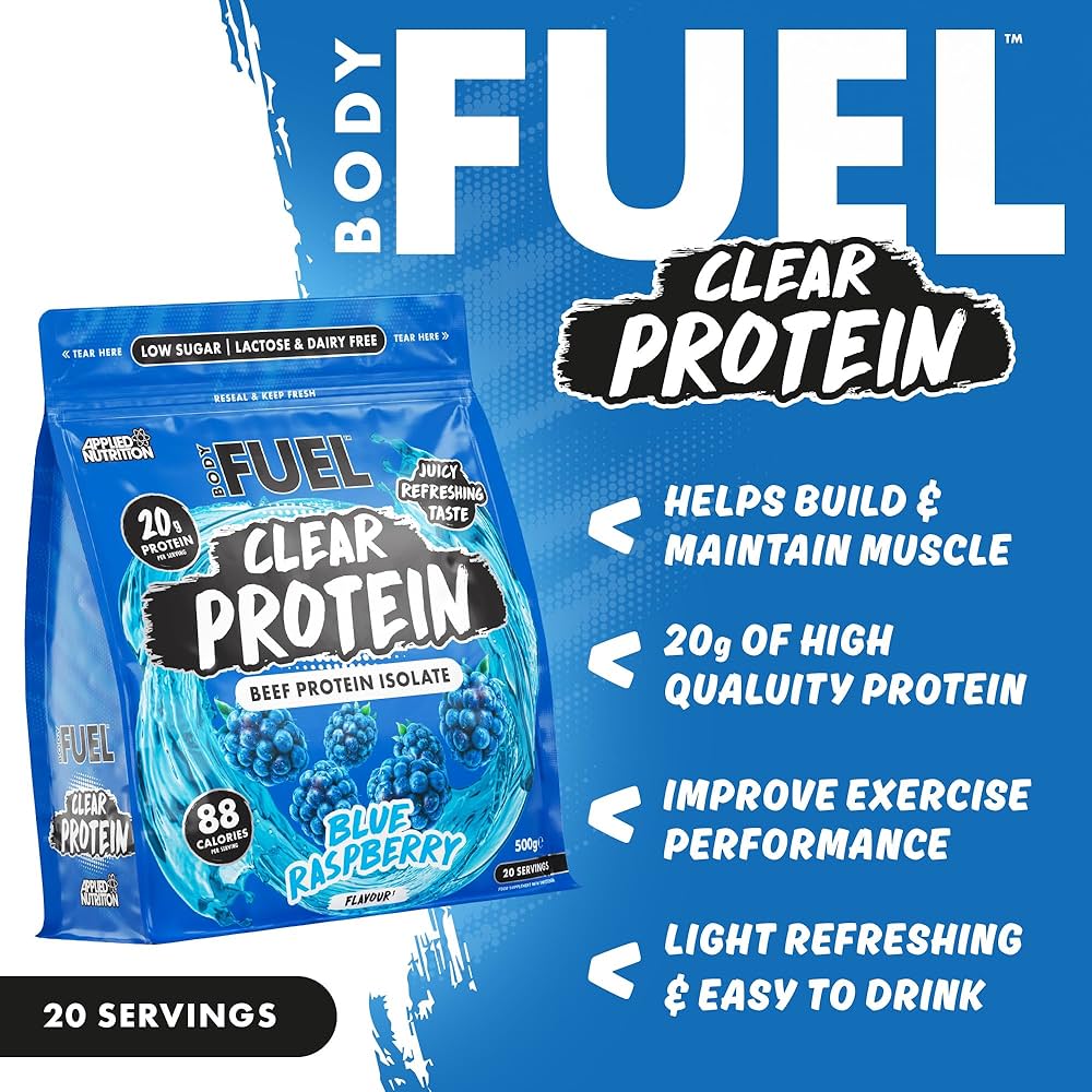 BodyFuel Clear Protein - Beef Protein Isolate - Clear & Refreshing - Best Low Sugar & Lactose-Free Protein Supplement - Muscle Support (500g - 20 Servings) (Blue Raspberry)