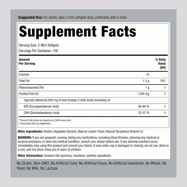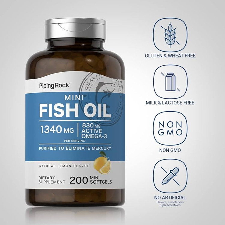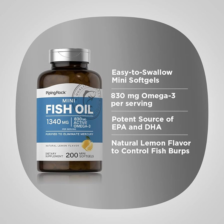 Piping Rock Mini Fish Oil 1340mg | 200 Softgels | Omega-3 Supplement for Men & Women | Lemon Flavor | Non-GMO and Gluten Free
