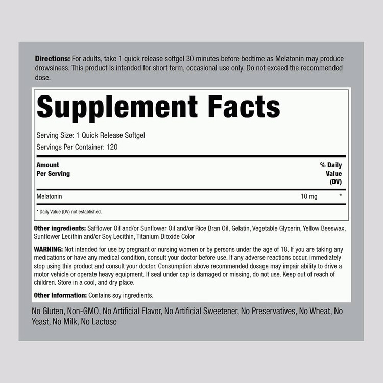 مکمل ملاتونین برند معتبر Piping Rock، هر کپسول نرم حاوی ۱۰ میلیگرم ملاتونین خالص با فرمول Quick Release برای جذب سریعتر در بدن است.