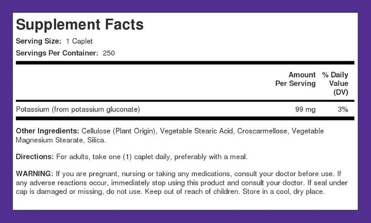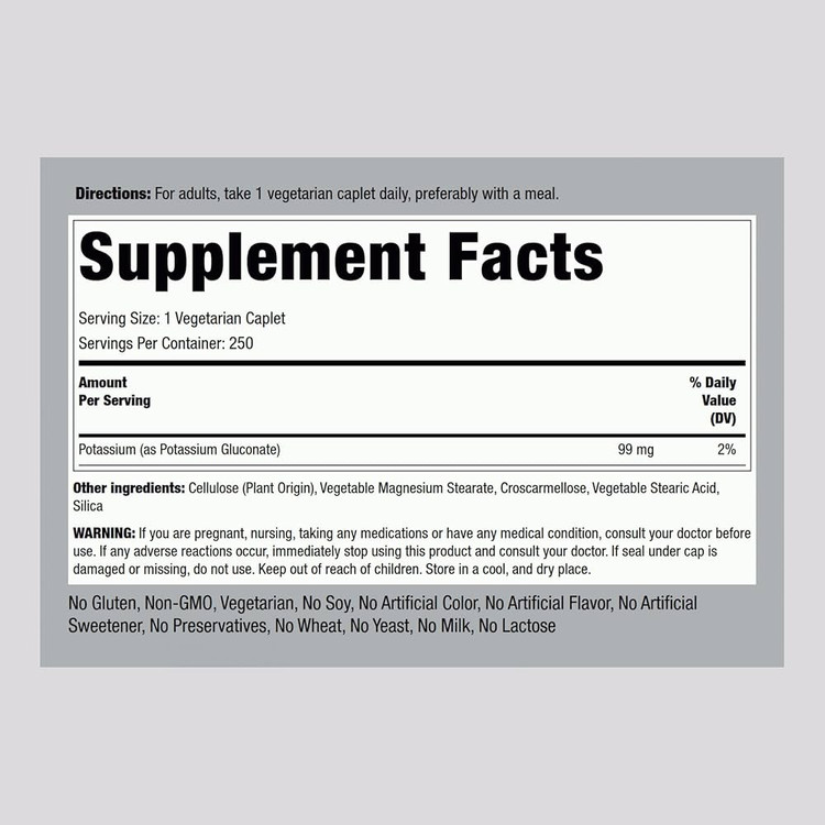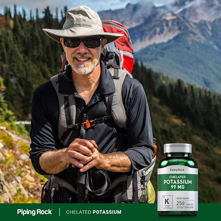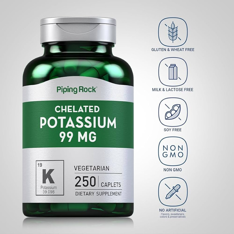Piping Rock Chelated Potassium Supplement 99 mg | 250 Caplets | Potassium Gluconate | Vegetarian, Non-GMO, Gluten Free