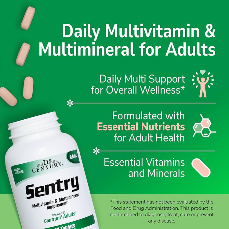 مکمل Sentry یک مولتیویتامین و مینرال کامل برای بزرگسالان است که شامل ترکیب متعادلی از ویتامینها، مواد معدنی و آنتیاکسیدانهای ضروری میباشد. این محصول برای تأمین ریزمغذیهای روزانه، حفظ انرژی، بهبود ایمنی بدن و پشتیبانی از سلامت عمومی طراحی شده است.