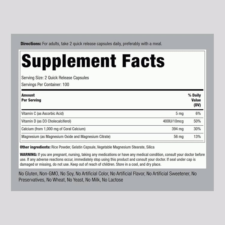 - نام انگلیسی: Piping Rock Ultra Coral Calcium Complex 1000 mg (200 Quick Release Capsules)