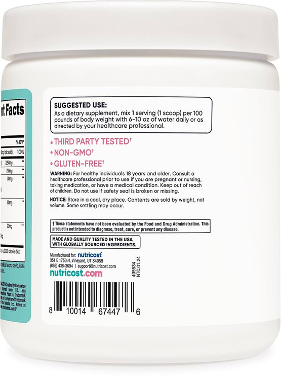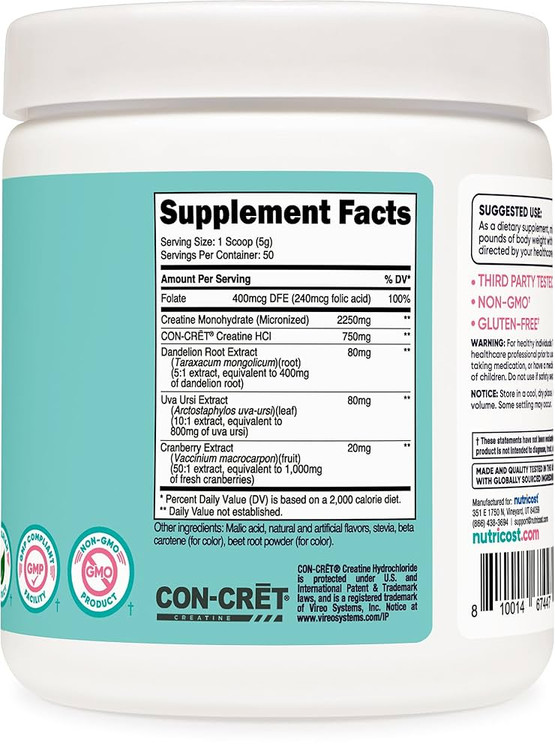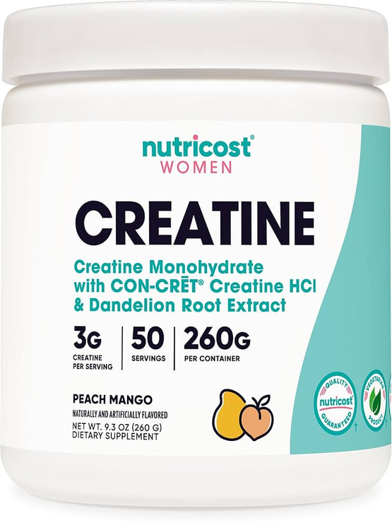 کراتین مخصوص بانوان Nutricost Women Creatine ترکیبی از کراتین مونوهیدرات خالص، کراتین HCl (CON-CRET®) و عصاره ریشه قاصدک است که بهصورت اختصاصی برای افزایش انرژی، بهبود عملکرد ورزشی، فرمدهی عضلات و کاهش احتباس آب در بدن طراحی شده است.