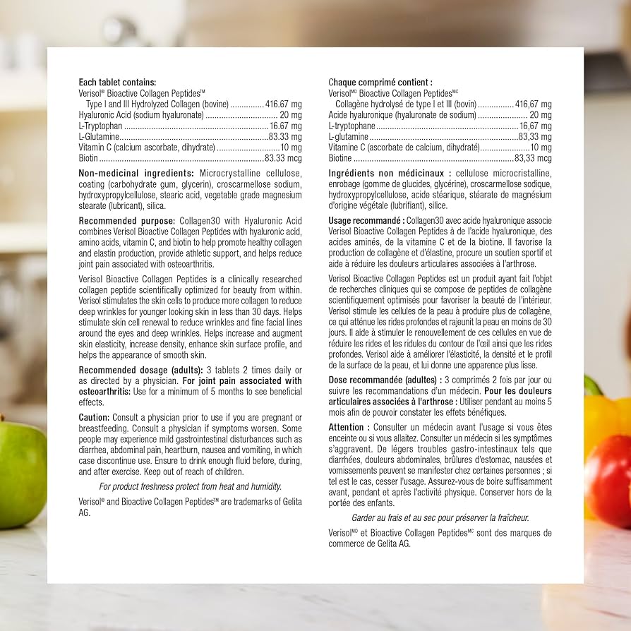 Collagen30 با فرمولی پیشرفته از برند معتبر Webber Naturals ترکیبی از پپتیدهای کلاژن فعال (Bioactive Collagen Peptides) و اسید هیالورونیک است که بهطور ویژه برای کاهش چینوچروک اطراف چشم، خطوط ریز صورت و بهبود انعطافپذیری پوست طراحی شده است.
